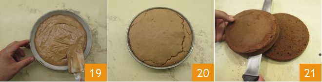 Beurrez et farinez un moule de 18 cm de diamètre, puis versez le mélange à l'intérieur, nivelez la surface 19 et faites cuire dans un four statique préchauffé à 170°C pendant 35 à 40 minutes. Après ce temps, vérifiez la cuisson avec un cure-dent, puis sortez le gâteau du four 20 ; ne vous inquiétez pas si le gâteau est craquelé en surface. Laissez le gâteau refroidir complètement avant de le démouler en le retournant sur un plan de travail. Ensuite, coupez le gâteau en deux disques en utilisant un couteau à lame longue et dentelée 21.