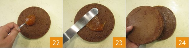 Disposez environ la moitié de la dose de confiture d'abricots à l'intérieur 22 et étalez-la avec une spatule sur toute la surface 23. Recouvrez avec le second disque 24