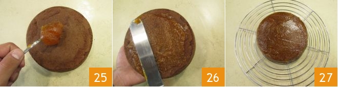 ajoutez une autre couche de confiture sur le dessus 25 et à l'aide d'une spatule, étalez-la partout pour créer un voile, même sur les bords du gâteau 26 ; de cette façon, l'effet final sera plus brillant. Transférez le gâteau sur une grille 27 et préparez la ganache.