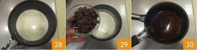 Portez la crème à ébullition dans une casserole 28 ; dès qu'elle commence à bouillir, éteignez le feu et ajoutez le chocolat 29. Mélangez avec un fouet jusqu'à ce que le chocolat soit complètement fondu et bien amalgamé 30.