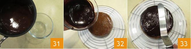Transférez ensuite la ganache dans un bol 31 et utilisez-la pour glacer le gâteau 32, en vous aidant d'une spatule et en la tapotant délicatement sur le plan de travail pour recouvrir à la fois la surface et les bords et la lisser en même temps 33. Pour être lisse et brillante, la ganache doit avoir une température d'environ 40°C.