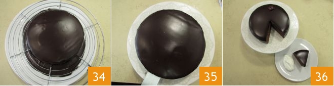 À ce stade, placez-la au réfrigérateur pour raffermir (à +4°C) pendant environ 20 minutes 34. Ensuite, transférez le gâteau Sacher sur un plat de service 35 et servez chaque tranche nature ou avec de la crème semi-montée non sucrée 36.