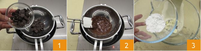 Pour préparer la Sachertorte, commencez par transférer le chocolat en petits morceaux dans un cul-de-poule 1 et faites-le fondre au bain-marie 2. Si vous préférez, vous pouvez faire fondre le chocolat au micro-ondes en le mettant en marche quelques secondes à la fois et en remuant à chaque interruption pour ne pas brûler le chocolat. Pendant ce temps, placez dans le bol d'un batteur le beurre mou, le sucre glace 3