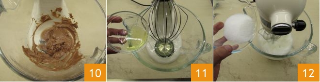 jusqu'à obtenir un mélange homogène 10. Versez ensuite les blancs d'œufs dans le bol d'un batteur et commencez à les monter à grande vitesse 11. Dès qu'ils deviennent blancs et mousseux (quand ils commencent à "monter"), versez progressivement le sucre semoule, toujours peu à peu 12 ; il est important d'attendre que les blancs soient légèrement montés avant d'ajouter le sucre, sinon le blanc deviendra trop lourd et aura beaucoup de mal à monter.