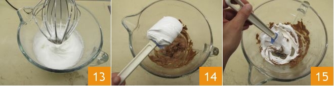 Les blancs d'œufs ne doivent pas être montés en neige très ferme, mais vous devez vous arrêter juste avant 13, sinon, lorsque vous les intégrerez dans la pâte, ils continueront de monter et le gâteau, une fois cuit, risque de s'affaisser. À ce stade, incorporez les blancs d'œufs en deux fois dans le mélange de jaunes et de chocolat 14 et mélangez avec une spatule 15 ou avec un fouet.