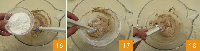 Ajoutez ensuite également la farine déjà tamisée 16 et mélangez de haut en bas avec une spatule 17, jusqu'à obtenir un mélange lisse et uniforme 18.