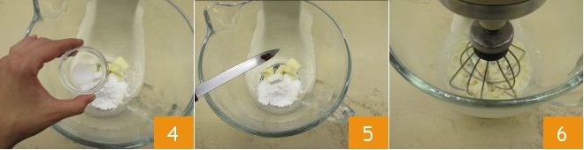 et une pincée de sel 4. Ajoutez également les graines de la gousse de vanille 5 et commencez à travailler le mélange avec le fouet 6 jusqu'à obtenir une consistance crémeuse.