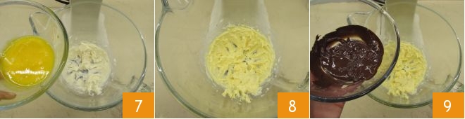Versez ensuite les jaunes d'œufs légèrement battus en deux fois 7 et continuez à monter le beurre 8 ; cela prendra environ 8 à 10 minutes. Il est important que le mélange de sucre glace, jaunes d'œufs et beurre soit bien monté pour que la pâte lève bien à la cuisson. Maintenant, assurez-vous que le chocolat fondu soit à une température comprise entre 45 et 55°C ; il est préférable d'utiliser un thermomètre pour le mesurer : si elle est trop élevée, elle risque de faire fondre le beurre, à l'inverse, elle risque de trop compacter le mélange. À ce stade, ajoutez le chocolat dans le mélange de beurre et de jaunes d'œufs 9 et continuez à mélanger