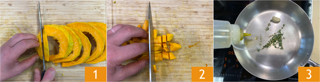 Pour préparer les coquilles Saint-Jacques sur crème de potiron avec herbes et speck, commencez par nettoyer le potiron et enlever la peau. Coupez 300 g de chair d'abord en tranches 1 puis en petits cubes 2. Dans une poêle, faites revenir l'huile avec une gousse d'ail et quelques brins de thym 3.
