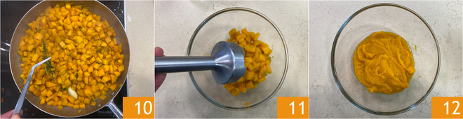 À ce stade, le potiron devrait être ramolli, alors retirez l'ail et le thym 10. Transférez le potiron dans un récipient 11 et mixez avec un mixeur plongeant pour obtenir une crème lisse et homogène 12.