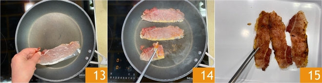 Mettez de côté et passez au speck : chauffez bien une poêle antiadhésive, puis déposez les tranches de speck 13 et faites-les dorer à feu moyen-élevé des deux côtés pendant environ 3-4 minutes 14. Lorsqu'elles sont croustillantes et dorées, retirez-les de la poêle et mettez-les de côté 15.