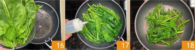 Mettez les herbes dans la même poêle 16, assaisonnez avec de l'huile 17, du sel et du poivre et faites cuire à feu moyen-doux pendant environ 3-4 minutes. Une fois fanées 18, mettez les herbes de côté.