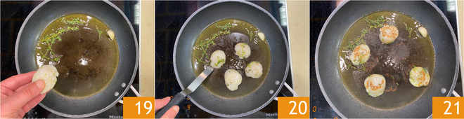 Enfin, faites cuire les coquilles Saint-Jacques : dans la poêle, chauffez pendant une minute l'huile avec l'ail et le thym, puis déposez les coquilles Saint-Jacques 19 et faites-les dorer à feu vif des deux côtés 20 pendant un total de 2-3 minutes 21.