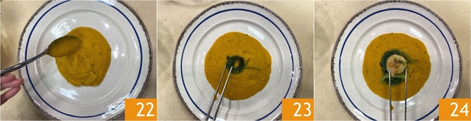 Vous êtes prêt à dresser : répartissez la crème de potiron à la base de l'assiette 22, formez un nid d'herbes au centre 23 et placez dessus une coquille Saint-Jacques 24.