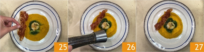Complétez avec une tranche de speck croustillant 25 et un tour de moulin à poivre 26. Vos coquilles Saint-Jacques sur crème de potiron avec herbes et speck sont prêtes à être servies 27 !