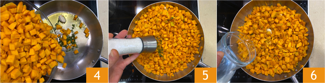 Ajoutez le potiron 4, salez 5 et poivrez. Couvrez avec environ 200-300 g d'eau 6 et faites cuire à feu moyen-élevé pendant environ 15 minutes.