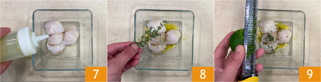 Entre-temps, assaisonnez les coquilles Saint-Jacques avec de l'huile 7, du sel, du poivre, du thym 8 et du zeste de lime râpé 9. Mélangez délicatement et laissez mariner au réfrigérateur pendant que vous continuez la recette.