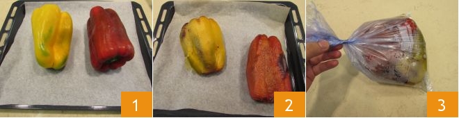 Pour préparer la salade avec thon, mozzarella et poivrons, commencez par laver ces derniers, puis disposez-les sur une plaque recouverte de papier sulfurisé 1 et laissez cuire à 250° pendant environ 30 minutes ou jusqu'à ce que vous remarquiez que la peau soit grillée 2, tournez-les de temps en temps pour une cuisson uniforme. Une fois cuits, mettez les poivrons dans un sac alimentaire et laissez-les fermés pour qu'ils refroidissent légèrement 3.