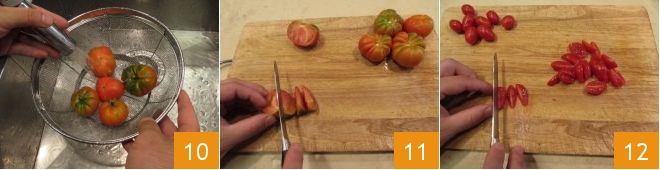 Après avoir lavé les tomates 10, retirez le pédoncule, coupez-les en deux et ensuite en tranches pour obtenir 4 à 5 quartiers par demi-tomate 11, puis faites de même avec les tomates cerises 12 en les coupant en 4 parties.