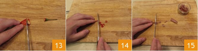 Enlevez le pédoncule du piment et coupez-le dans le sens de la longueur en retirant les graines internes à l'aide de la pointe du couteau 13, puis tranchez-le finement 14, ainsi vous n'aurez que le parfum du piment sans un goût piquant marqué. À part, émiettez les filets d'anchois 15.