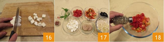 Ensuite, coupez la mozzarella d'abord en tranches épaisses, puis en lanières et enfin en cubes de quelques centimètres 16, égouttez le thon en conserve et vous aurez tous les ingrédients prêts pour composer la salade 17. Puis, mettez ensemble les tomates cœur de bœuf et cerises dans un grand récipient et ajustez le sel et le poivre 18.