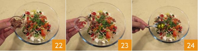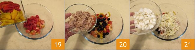 Ajoutez les poivrons 19, les olives noires entières et le thon que vous aurez émietté avec une fourchette 20, l'endive et les cubes de mozzarella 21.
