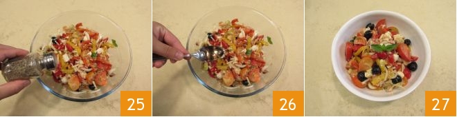 ajustez le sel et le poivre 25, versez le vinaigre 26 et mélangez. Votre salade avec thon, mozzarella et poivrons est maintenant prête : il ne vous reste plus qu'à la parfumer avec quelques feuilles de basilic et à la déguster ! 27