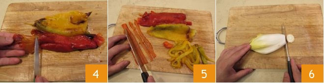 Une fois qu'ils ont refroidi, enlevez la peau des poivrons, qui se détachera très facilement 4, puis divisez-les en deux, retirez la partie supérieure et les graines internes, puis coupez-les en lanières d'environ 1 cm 5. Nettoyez l'endive en éliminant l'extrémité 6,