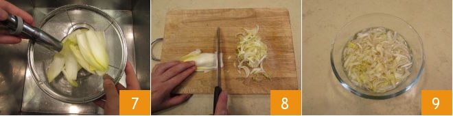 défeuillez-la complètement et rincez-la à l'eau courante 7 pour éliminer les éventuels résidus de terre, puis laissez égoutter un moment, coupez l'endive en lanières avec un couteau 8 et mettez-les dans beaucoup d'eau froide 9 pour éviter que les parties coupées ne s'oxydent en changeant de couleur.