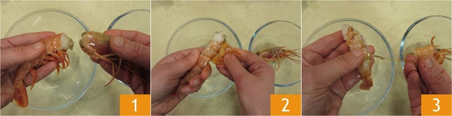 Pour préparer la salade de crevettes géantes et avocat, commencez par vous occuper de la Comment nettoyer les crevettes : détachez la tête 1, puis retirez la carapace 2 et l'intestin situé sur le dos des crustacés 3.