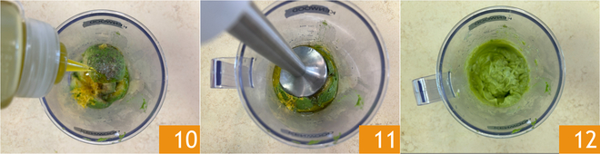 Ajoutez l'huile 10 et mixez avec un mixeur plongeant 11 jusqu'à obtenir une crème lisse et homogène 12.
