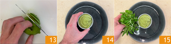 Nettoyez maintenant le deuxième avocat, retirez le noyau et coupez la pulpe en tranches 13. Placez au centre d'un plat de service un petit bol avec la crème d'avocat 14, puis répartissez la mâche tout autour 15.