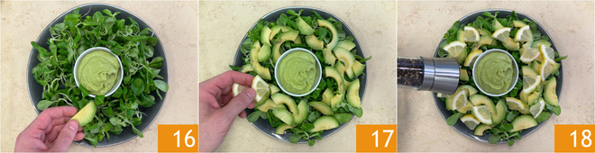 Disposez sur la mâche les tranches d'avocat 16 et celles de citron 17. Assaisonnez avec du sel et du poivre 18.