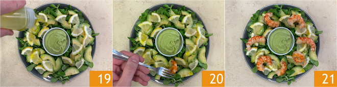 Complétez avec un filet d'huile 19 et enfin ajoutez les crevettes géantes 20. Votre salade avec crevettes géantes et avocat est prête à être servie 21!