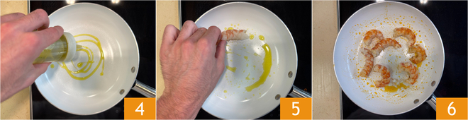 Dans une poêle, chauffez un filet d'huile 4, puis déposez les crevettes géantes 5 et faites-les dorer à feu moyen des deux côtés, pendant un total de 5 minutes 6. Mettez de côté.
