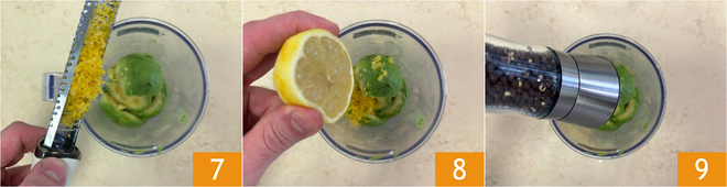 Passez à la crème d'avocat : extrayez la pulpe de l'avocat et transférez-la dans un récipient avec le zeste 7 et le jus de citron 8, puis salez et poivrez 9.