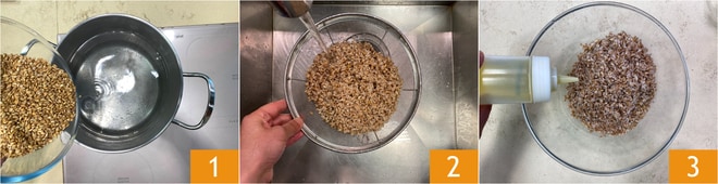 Pour préparer la salade d'épeautre avec pesto aux herbes et primo sale, faites bouillir l'épeautre 1 (cet épeautre instantané sera prêt en environ 12 minutes), salez à la fin de la cuisson. Égouttez et rincez à l'eau froide 2, versez dans un bol et assaisonnez avec un filet d'huile 3.