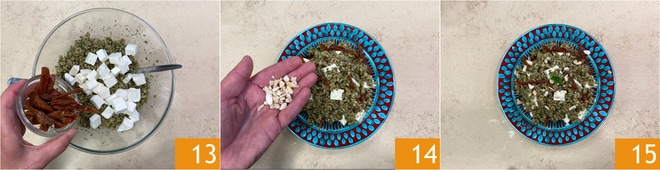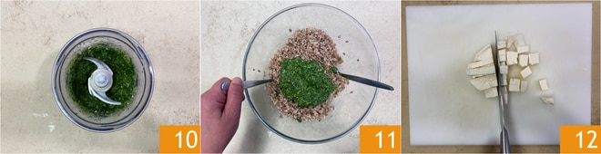 Activez les lames pour mixer le tout 10. Versez le pesto dans l'épeautre 11 et mélangez. Coupez le primo sale en dés 12.