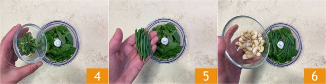 Préparez le pesto en versant dans le bol du mixeur le basilic, la marjolaine 4, la ciboulette 5 et les noix de cajou 6.