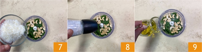 Ajoutez le Pecorino 7, salez 8 et versez l'huile 9.