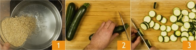 Pour réaliser la salade d'orge avec pesto de roquette, haricots verts et courgettes, commencez par porter à ébullition une casserole d'eau salée et faites cuire l'orge pour le temps indiqué sur l'emballage 1. Pendant ce temps, mettez une autre casserole sur le feu et portez-la à ébullition pour cuire les légumes et continuez avec la préparation des autres ingrédients : lavez et coupez les extrémités des courgettes 2, puis coupez-les en rondelles 3.