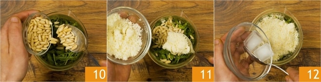 Il ne vous reste plus qu'à préparer le pesto de roquette : lavez et séchez la roquette, puis mettez-la dans un récipient haut et étroit avec les pignons de pin 10, le Parmigiano râpé 11 et quelques glaçons 12.