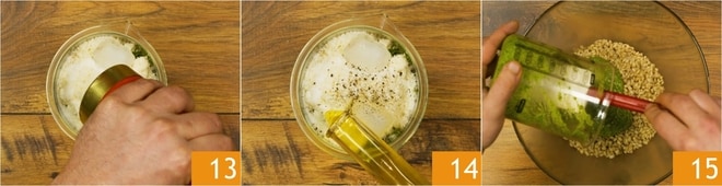 Salez, poivrez 13 et ajoutez environ 5 cuillères à soupe d'huile 14. Mixez avec un mixeur plongeant pour obtenir une sauce crémeuse et homogène ; si nécessaire, ajoutez un peu plus d'huile pour obtenir la consistance désirée. Versez le pesto de roquette dans le bol avec l'orge 15 et mélangez bien.