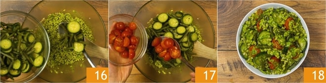 Ajoutez également les haricots verts avec les courgettes 16 et les tomates cerises 17. Mélangez le tout et servez votre salade d'orge avec pesto de roquette, haricots verts et courgettes 18 !