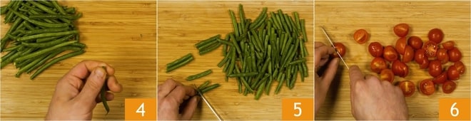 Équeutez également les haricots verts 4 et coupez-les en 2-3 parties 5, puis coupez les tomates cerises en deux 6.