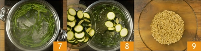 Ajoutez les haricots verts dans l'eau bouillante 7 et, après 5 minutes, ajoutez aussi les courgettes 8. Faites cuire les légumes pendant environ 10 minutes, ils doivent rester croquants. Une fois le temps de cuisson de l'orge écoulé, égouttez-le dans un grand bol 9.
