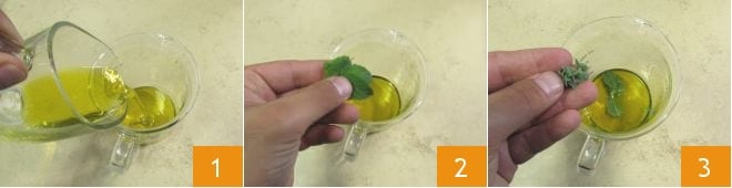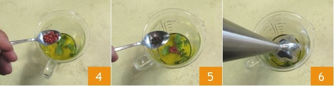 Pour préparer la salade de bœuf épicé et Grana Padano, commencez par préparer la marinade pour la viande : versez l'huile d'olive dans un verre haut et étroit 1, ajoutez les feuilles de menthe 2, le thym 3,