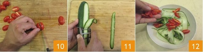En attendant, occupez-vous du reste du plat : lavez et puis divisez les tomates cerises en 4 parties 10, épluchez le concombre et coupez-le en fines tranches à l'aide d'un éplucheur 11. Disposez les concombres dans un bol et ajoutez les tomates cerises coupées 12.