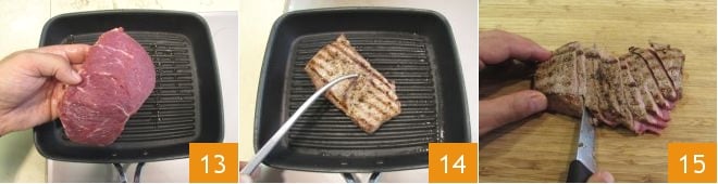 Maintenant, vous pouvez cuire la viande : une fois le temps de marinade écoulé, cuisez le filet sur une plaque bien chaude pendant environ 3-4 minutes de chaque côté (13-14). Transférez le filet sur une planche à découper, laissez-le reposer quelques secondes et coupez-le en fines tranches transversales 15.