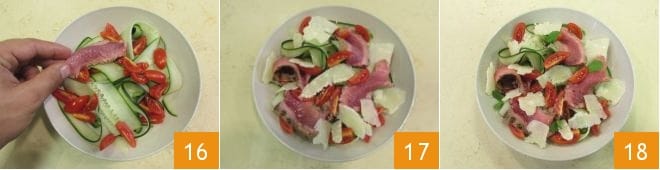 Maintenant, vous pouvez compléter la salade : disposez les tranches de viande sur les concombres et tomates 16, ajoutez les copeaux de Grana Padano AOP 17, assaisonnez avec un filet d'huile, du sel et du poivre et, enfin, garnissez avec quelques feuilles de menthe fraîche. Votre salade de bœuf épicé et Grana Padano est prête à être dégustée 18 !